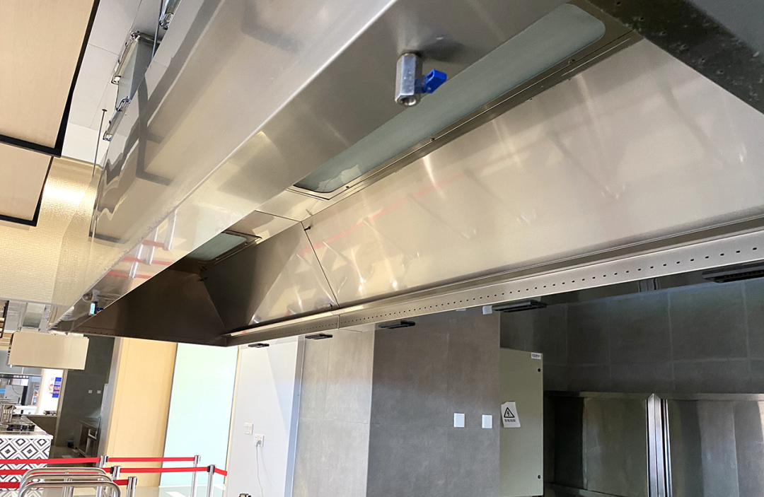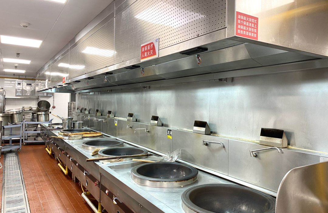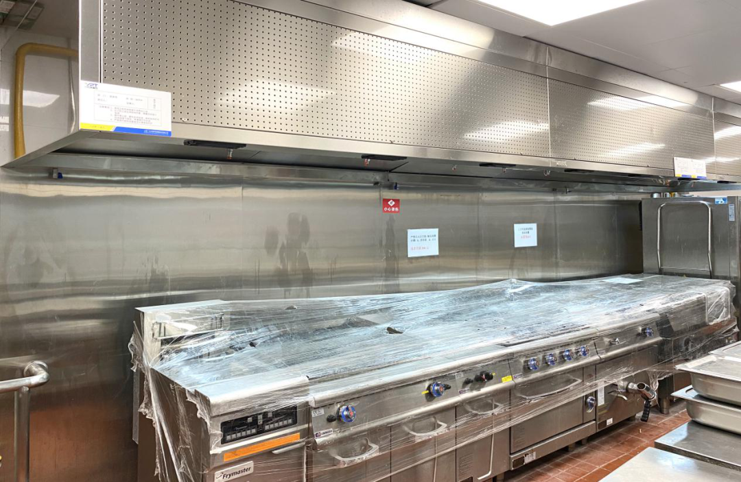 餐厅厨房还配备了国际领先的ANSUL灭火系统,灭火系统大约在一分钟左右通常能将烹调油或油脂的温度降低到自燃温度以下,这比传统的湿式灭火剂系统快了15倍,且ANSUL灭火系统布置有下喷、横喷、上喷3个方向喷头无死角扑灭可能产生的火源。在ANSUL灭火系统和DIRK烟罩相结合,更加有效地保障了厨房的消防安全。
