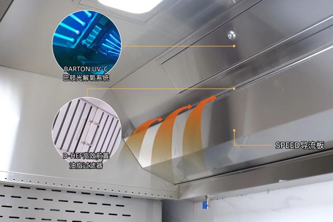 通过CFD模型分析而设计的SPEED导流板,配合D-AIR JET 风幕捕捉系统使得油烟更容易被快速推送到排烟腔体,从而进一步提高油烟排放效率。