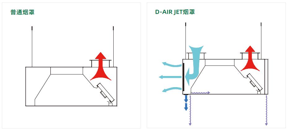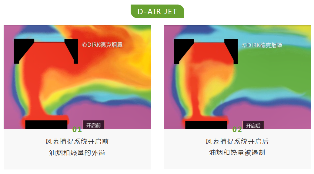 对比图客观展现了DIRK德克排油烟罩的捕捉和吸纳能力。利用空气动力学和文丘里原理,有效地将油烟锁定在排油烟罩内,水平的风幕将油烟流动路径推向后端的D-HEF高效油脂过滤器,进而进入净化阶段;而垂直的风幕可以形成阻隔,防止捕获区受到气流的影响,某种程度上“扩大了”烟罩容纳面积,同时大大减少油烟的扩散。